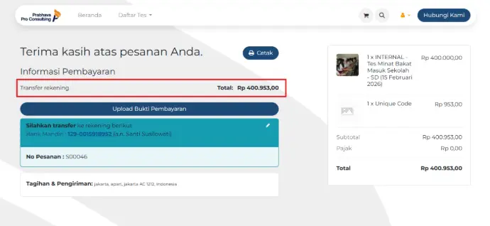 Lakukan pembayaran ke rekening yang sudah tertera di informasi pembayaran dengan nominal yang sudah ditambahkan kode unik.